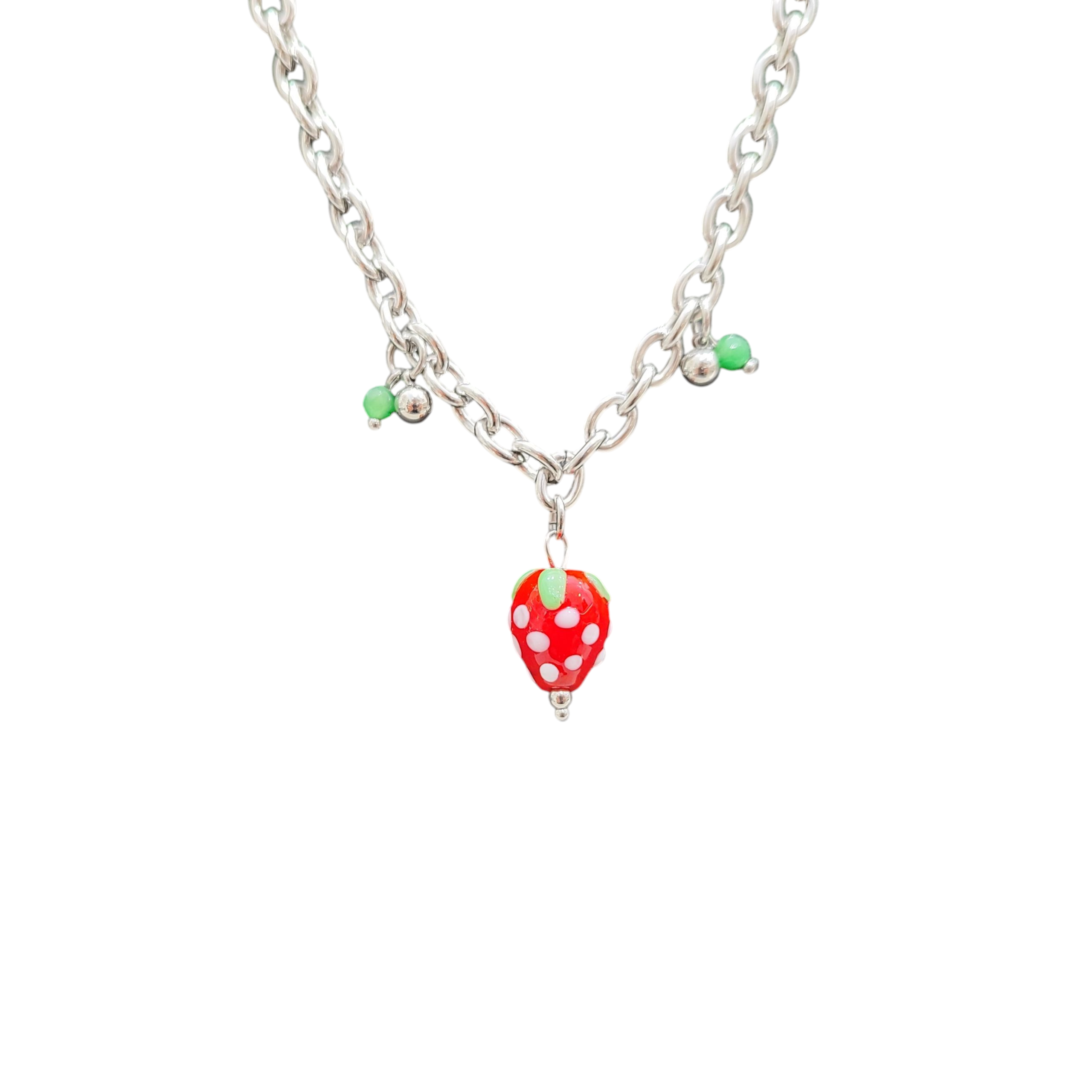 Η χοντρή, ασημένια αλυσίδα του δημιουργεί μια μοντέρνα αισθητική, ενώ το κεντρικό κρεμαστό με τη φράουλα από σμάλτο με τα άσπρα πουά είναι το απόλυτο highlight.