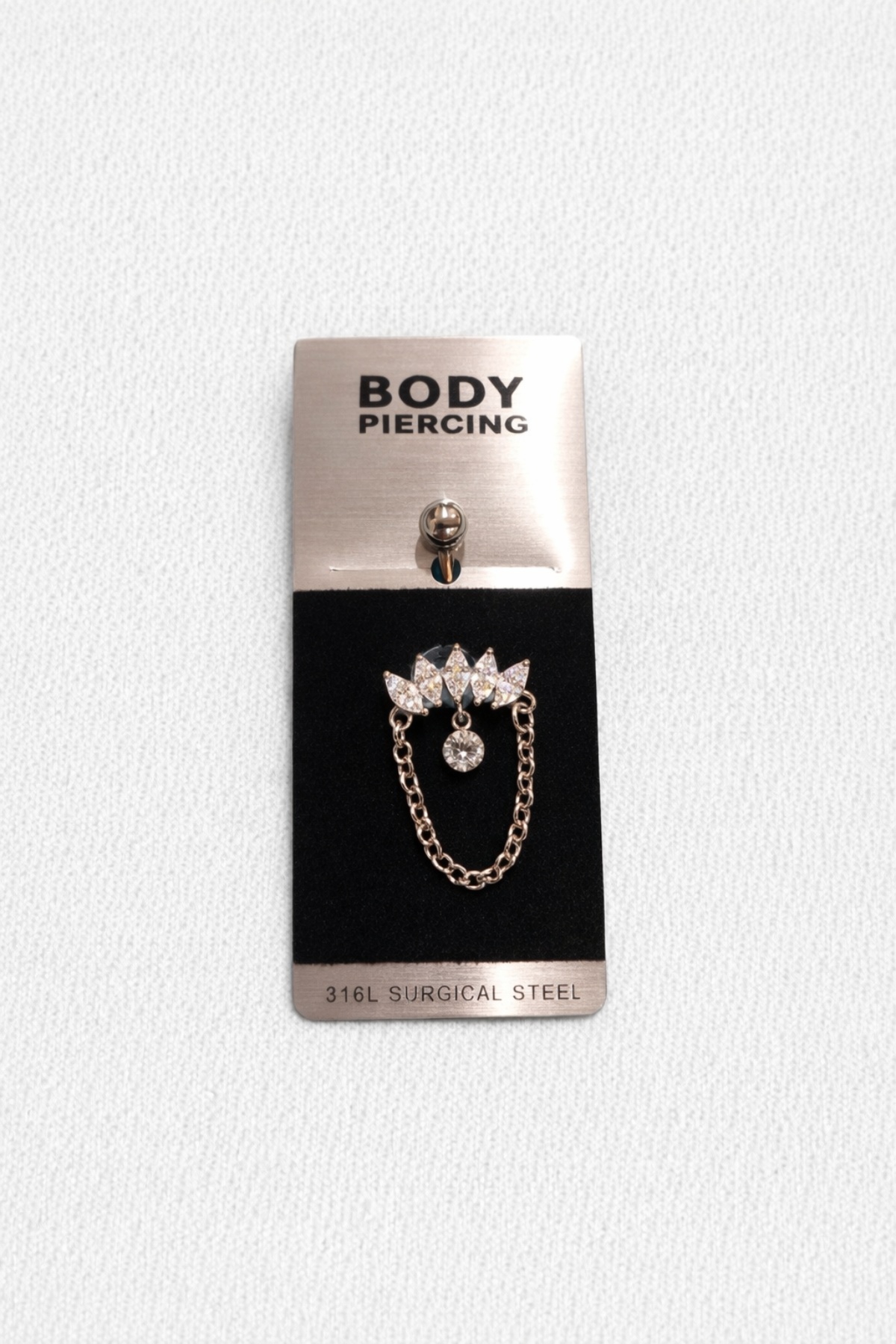 Το design είναι εμπνευσμένο από κορώνα, με πέντε λαμπερούς κρυστάλλους σε σχήμα μαρκίζ που σχηματίζουν ένα εντυπωσιακό crown–effect. Στο κέντρο, ένας κρεμαστός στρογγυλός κρύσταλλος προσθέτει έξτρα sparkle, ενώ οι δύο λεπτές αλυσίδες δημιουργούν ένα chic, εντυπωσιακό layer γύρω από τον αφαλό.