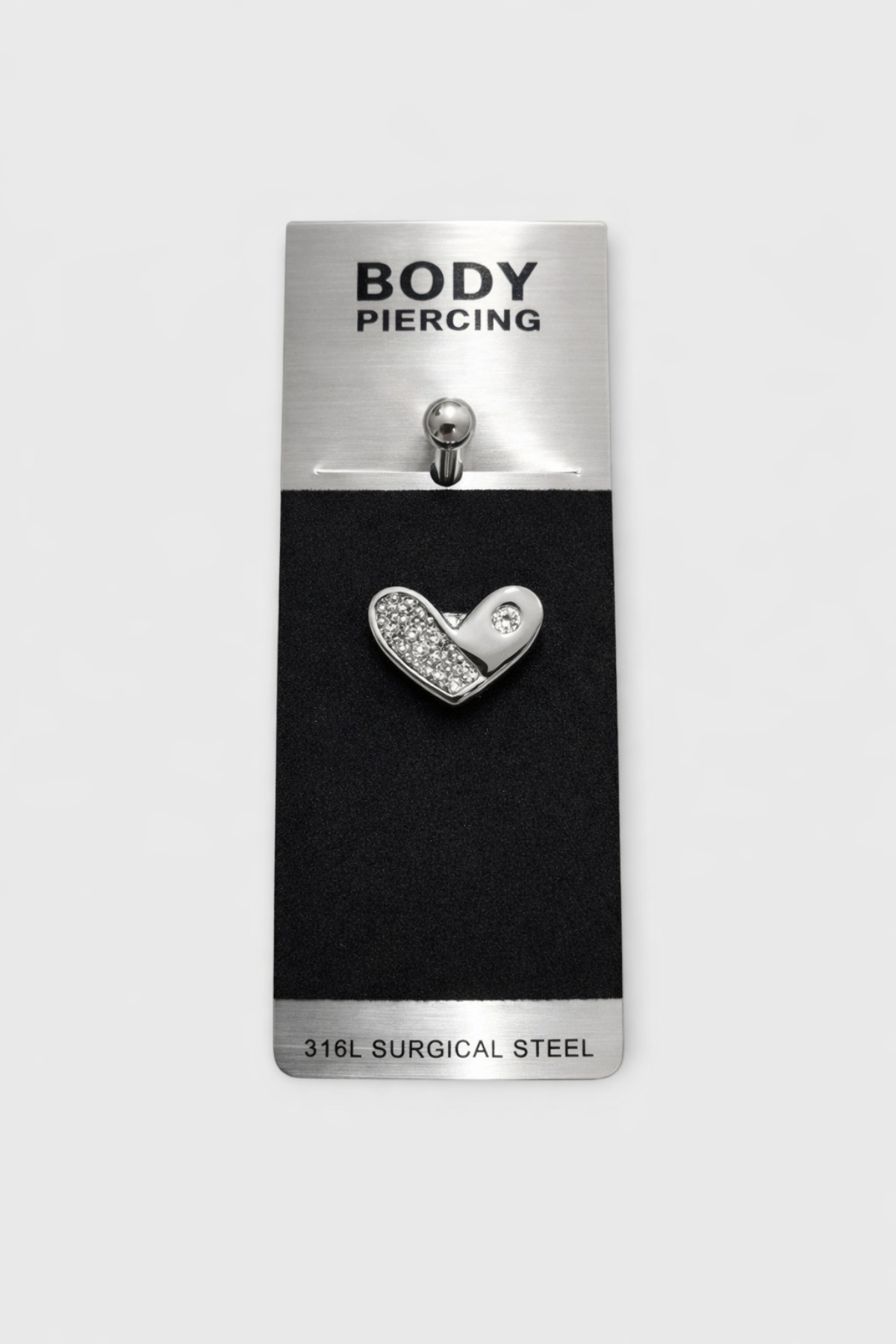 Piercing αφαλού με ασύμμετρη ασημί καρδιά και κρυστάλλους, από 316L surgical steel.