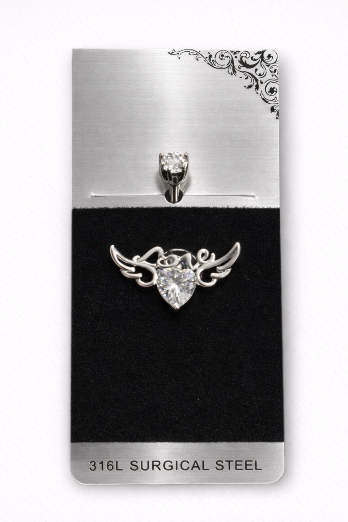 Piercing αφαλού σε ασημί απόχρωση με καρδιά-κρύσταλλο και φτερά “love” από 316L surgical steel.