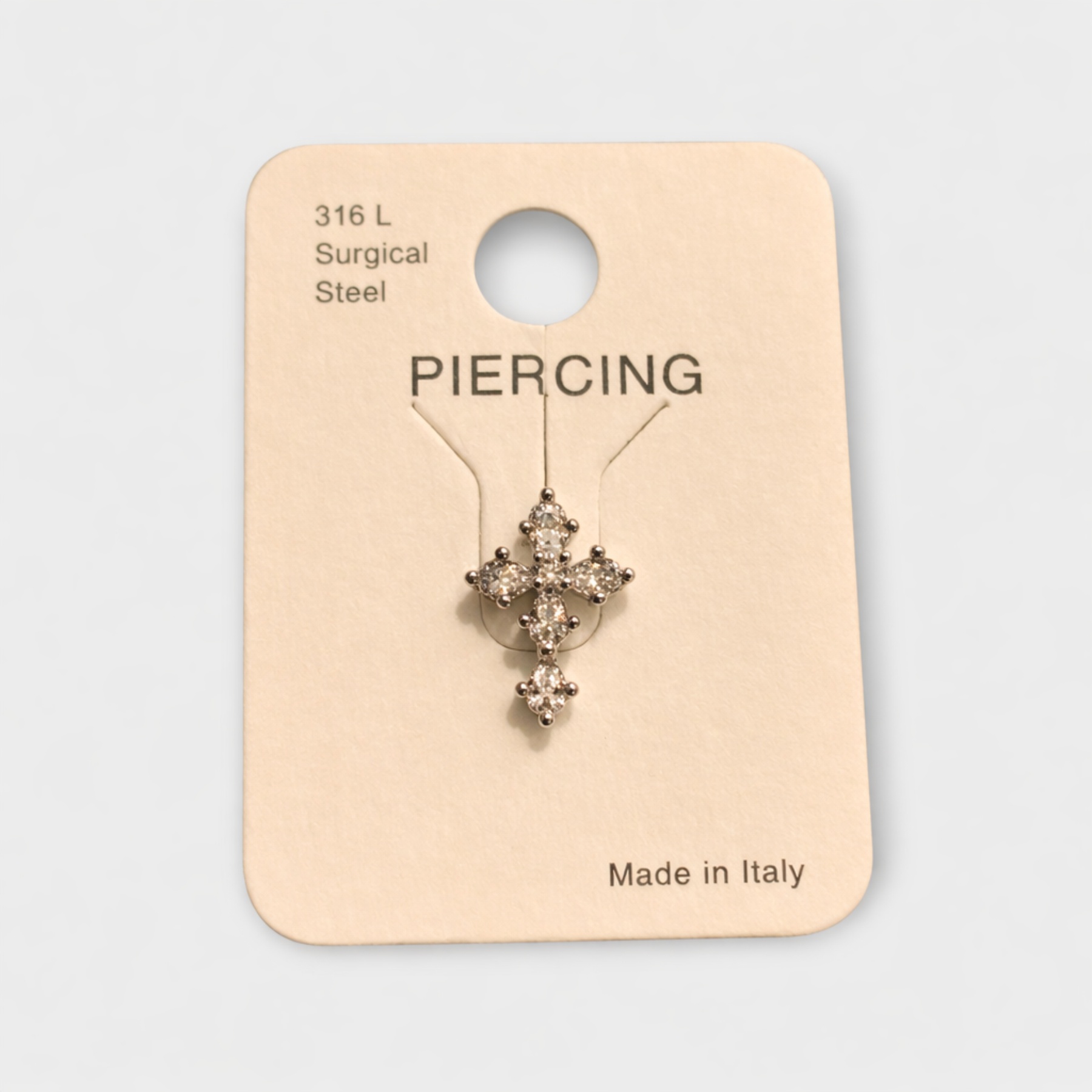 ΤΡΑΓΟΣ PIERCING ιδιαίτερου σχεδιασμού, υψηλής ποιότητας και αισθητικής, με κομψό σχέδιο σταυρού διακοσμημένο με λαμπερές πέτρες που προσφέρουν διακριτική λάμψη και κομψότητα. Κατασκευασμένο από 316L χειρουργικό ατσάλι, εξασφαλίζει ανθεκτικότητα, υποαλλεργική προστασία και άνετη εφαρμογή για καθημερινή χρήση. Το ΤΡΑΓΟΣ PIERCING Crystal Cross Glow αποτελεί ιδανική επιλογή για όσους αγαπούν τα διαχρονικά σύμβολα και θέλουν να προσθέσουν μία elegant και μοντέρνα πινελιά στο στυλ τους. Made in Italy, με έμφαση στη λεπτομέρεια και την υψηλή ποιότητα κατασκευής.