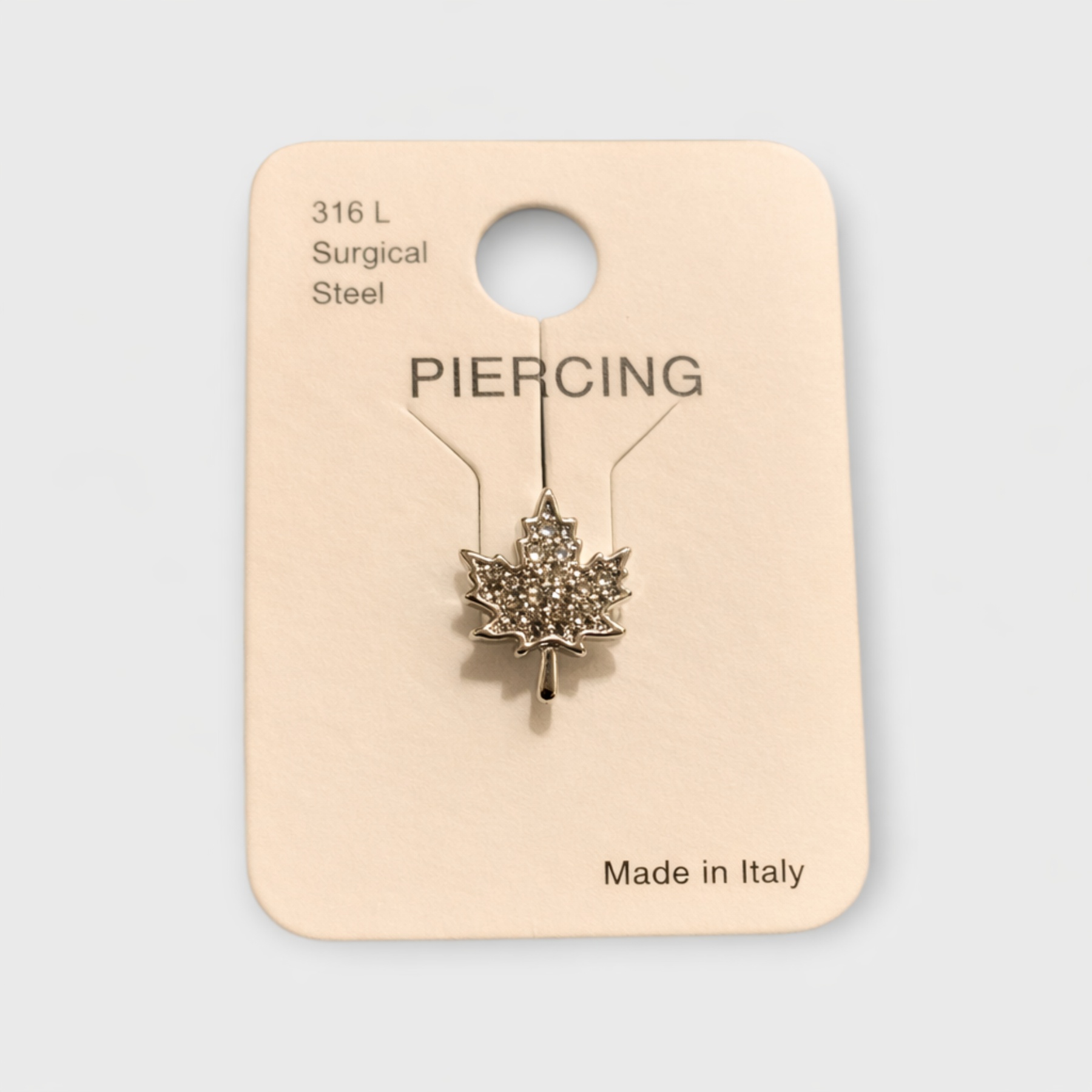 ΤΡΑΓΟΣ PIERCING ιδιαίτερου σχεδιασμού, υψηλής ποιότητας και αισθητικής, με εντυπωσιακό σχέδιο φύλλου σφενδάμου διακοσμημένο με λαμπερές πέτρες που χαρίζουν μοναδική λάμψη και στυλ. Κατασκευασμένο από 316L χειρουργικό ατσάλι, προσφέρει ανθεκτικότητα, υποαλλεργική προστασία και άνετη εφαρμογή για καθημερινή χρήση. Το ΤΡΑΓΟΣ PIERCING Maple Sparkle είναι ιδανικό για όσους θέλουν να προσθέσουν μία μοντέρνα και κομψή πινελιά στις εμφανίσεις τους, αναδεικνύοντας την προσωπικότητά τους με ένα διακριτικό αλλά λαμπερό κόσμημα. Made in Italy με έμφαση στη λεπτομέρεια και την ποιότητα.