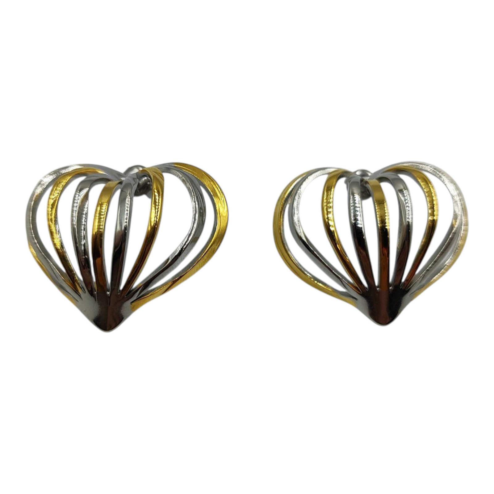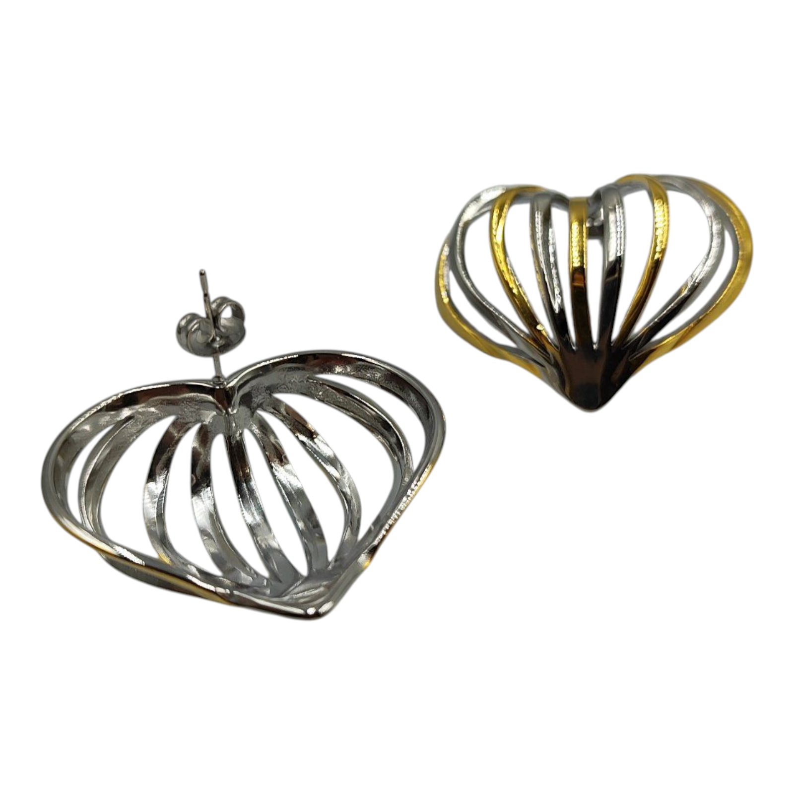 Εντυπωσιάστε με αυτά τα μοναδικά δίχρωμα σκουλαρίκια σε σχήμα καρδιάς. Ο ανοιχτός σχεδιασμός τους δημιουργεί μια αίσθηση κομψότητας και ελαφρότητας, συνδυάζοντας αρμονικά το χρυσό και το ασημί.