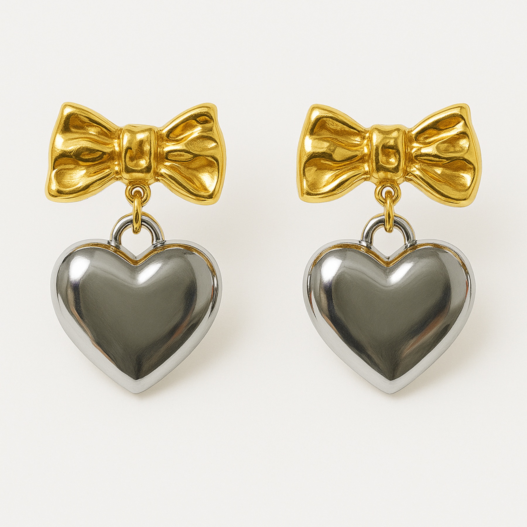 Προσθέστε μια παιχνιδιάρικη αλλά και κομψή πινελιά στο στυλ σας με αυτά τα εντυπωσιακά ατσαλινα σκουλαρίκια. Ο χρυσός φιόγκος συνδυάζεται με την ασημί καρδιά σε ένα σχέδιο που αποπνέει ρετρό γοητεία και σύγχρονη λάμψη. Ιδανικά για εμφανίσεις που ξεχωρίζουν – από πρωινά looks μέχρι βραδινές εξόδους.