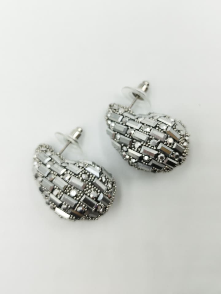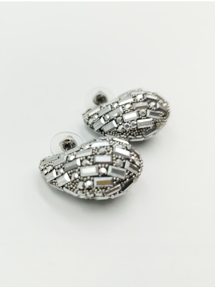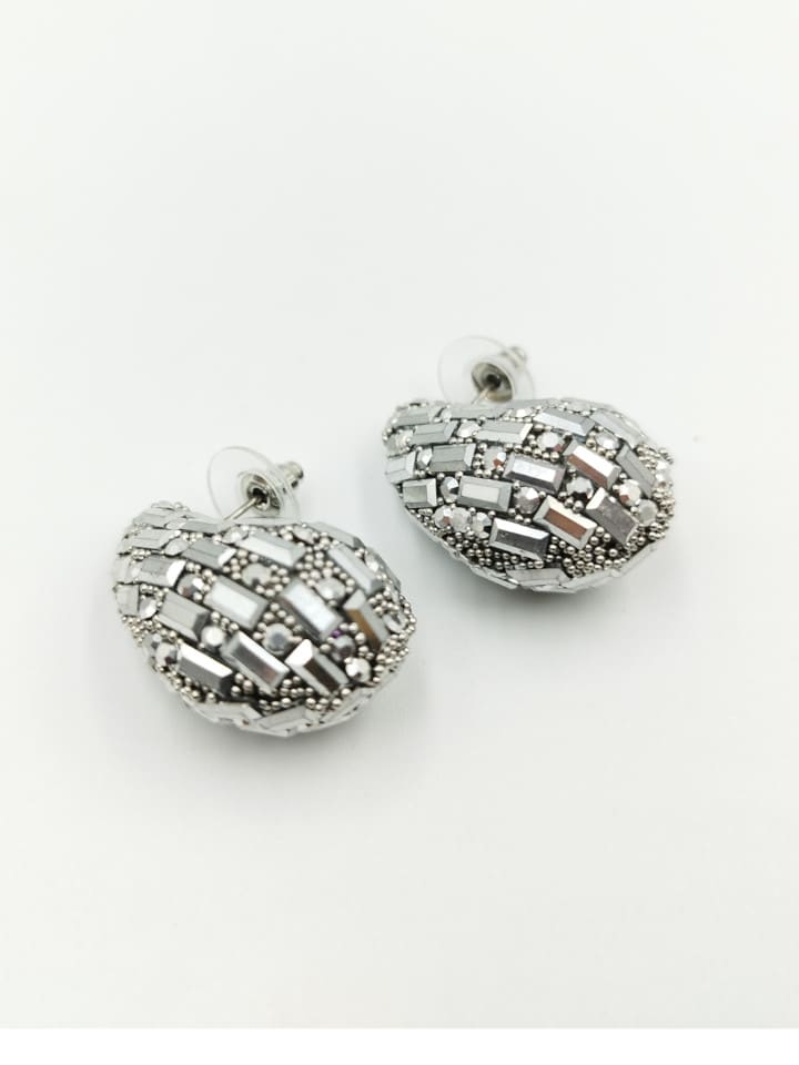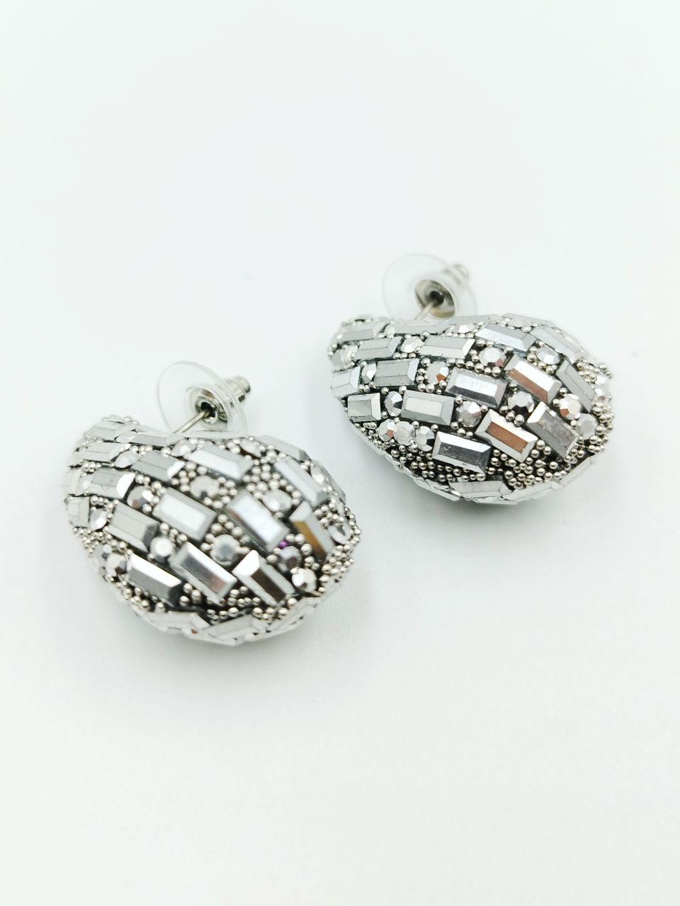 Ασημένια σκουλαρίκια με ανάγλυφο σχέδιο και λεπτομέρειες από στρας που αντανακλούν το φως, προσθέτοντας λάμψη και κομψότητα σε κάθε εμφάνιση.