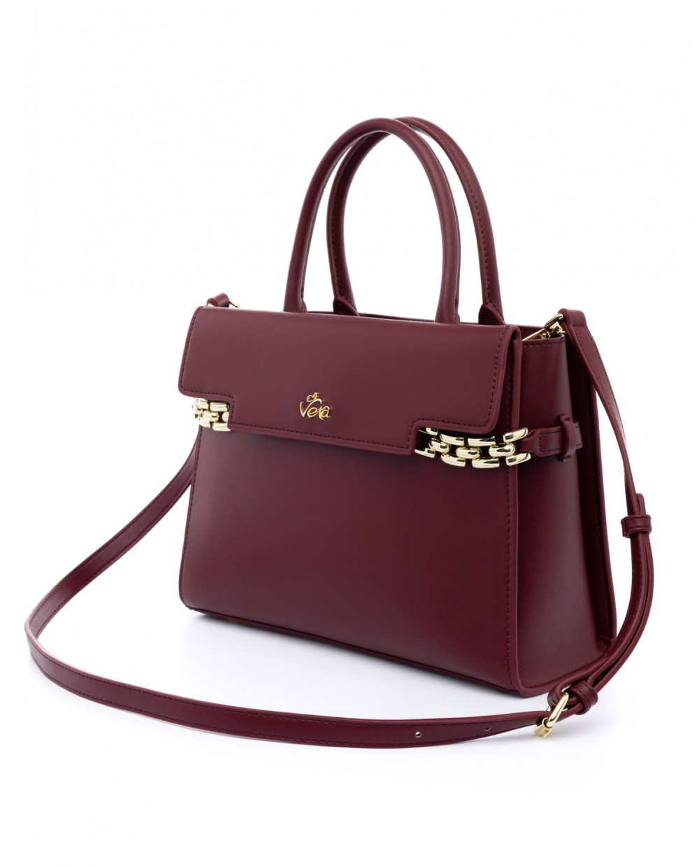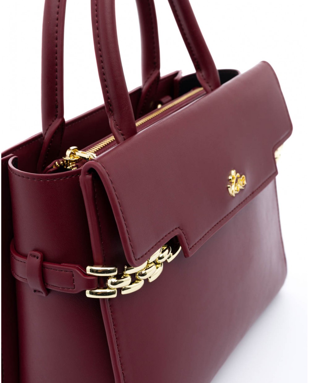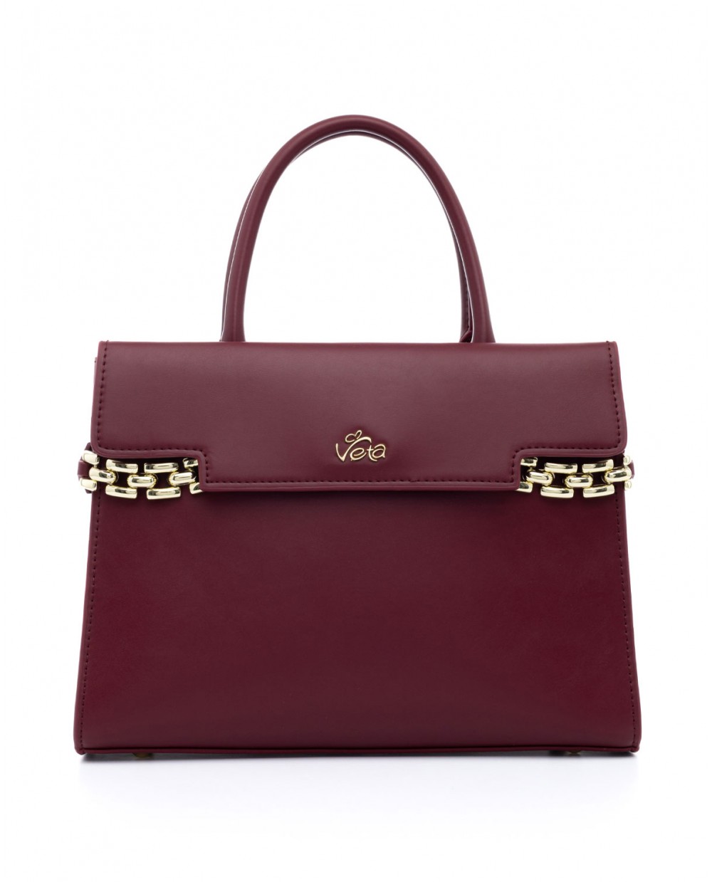 Τσάντα χειρός μπορντό με διακοσμητικά χρυσά μπρασελέ.